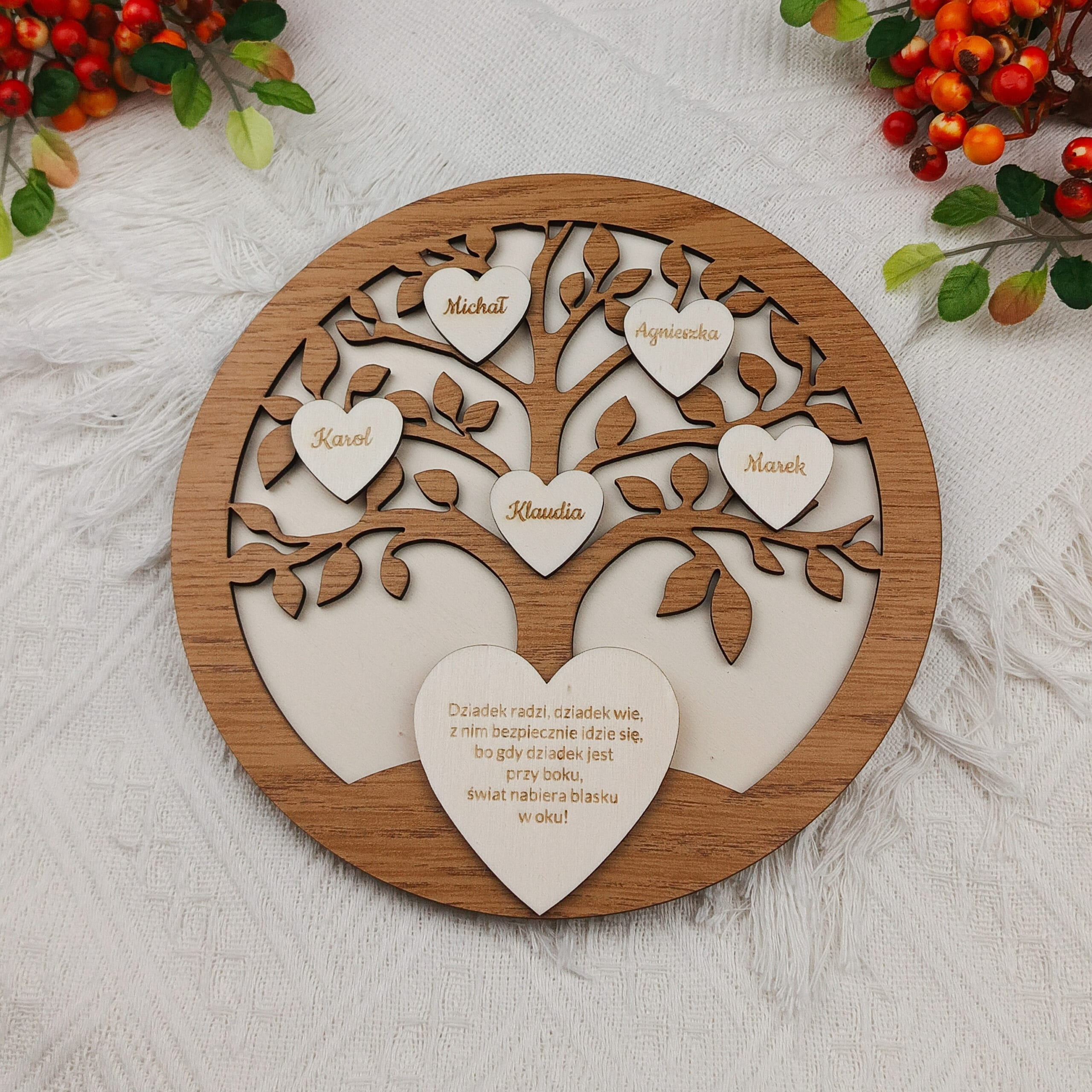 Na jego gałęziach umieściliśmy serca z imionami wnuków, dzięki czemu dekoracja staje się osobistą historią rodziny. Centralny element z grawerowanym cytatem podkreśla znaczenie roli dziadków i sprawia, że obraz jest nie tylko ozdobą, ale również wzruszającą pamiątką.